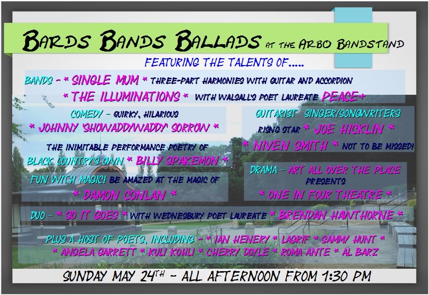 In 2014, Al Barz created a free show, Bards, Bands and Ballads, in Walsall Arboretum Bandstand. It was five hours on a summer Sunday afternoon with a host of singers, comedians, and poets and he did the same the following year.
